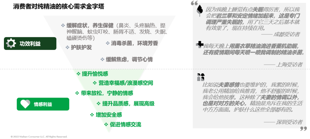 从功效利益上看,精油类产品能缓解症状,养生保健,消毒杀菌,环境芳香 ,护肤护发 ,缓解焦虑,调节心情,从情感利益上看能提升放松,愉悦感 红桃视频在线,和增加安全感和促进情感交流, 。