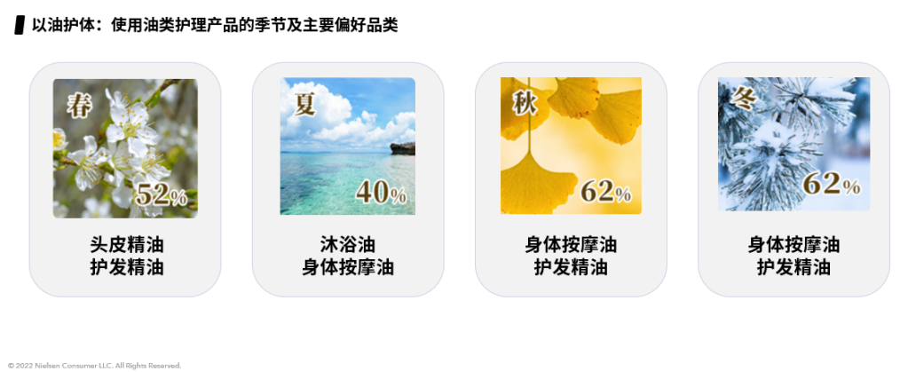 数据说明:请问您通常会在哪个季节使用油类护发/身体护理产品?(N=736,多选)