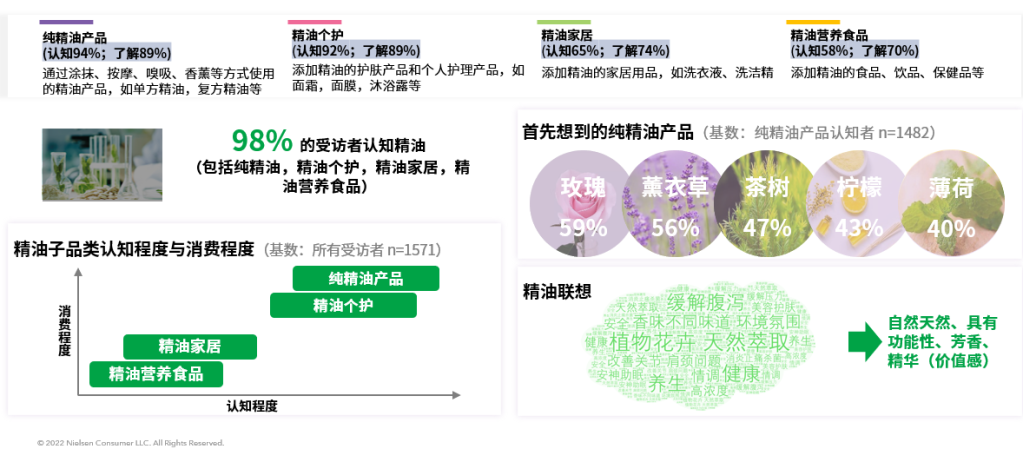从2020年至2022年,受访的消费者对精油品类产品的认知从52%快速增长到了98%,增长了46%。从调研的消费者的背景来看,对于精油品类的认知消费者主要是国内一二线经济发达的地区。另外从总体上来看,整个精油红桃视频高清玩家众多,但多数消费者只停留在对精油比较粗浅的了解中,从认知者到尝试者的转换率普遍比较低。因此,在今后整个红桃视频高清还有很多需要发展的空间。