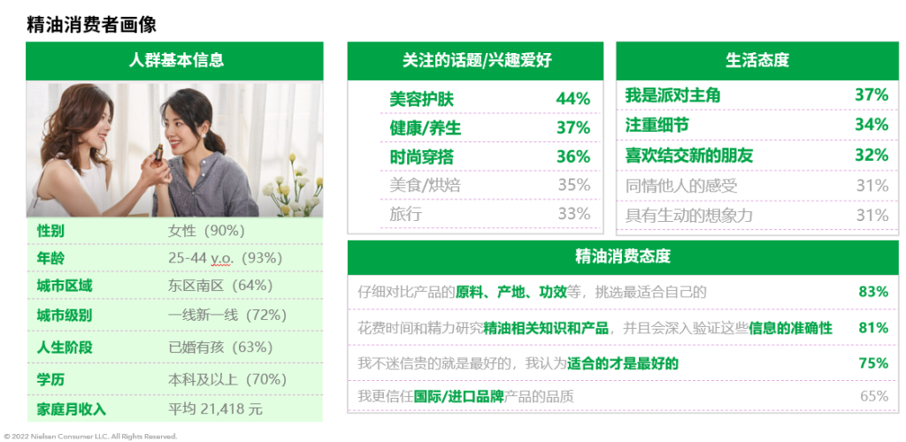 精油消费者女性为主,学历高,有一定经济基础,生活丰富多彩,她们爱美爱生活,一些处在已婚已孕的人生阶段,喜欢各种情绪消费使身心得到舒缓和调理。,她们对精油的态度积极,并有着独立的自我个性和判断力,日常会愿意花更多精力去了解精油的原料、产地和功效等内容,并喜欢反复验证各种信息的准确性。