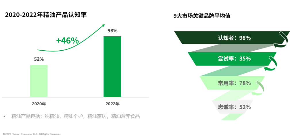 过去两年中,精油品类在消费者中认知率中提高明显,但总体消费者尝试率有限;不过,在客户粘性方面,整个品类的表现良好。