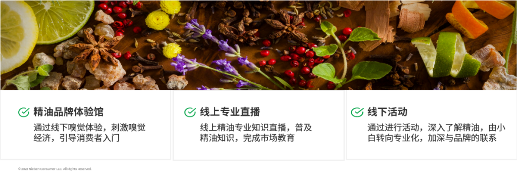 对于精油香氛品牌而言,线上线下双渠道联动逐渐成为未来趋势;线下体验馆、直播课程、线下活动等丰富多元。
