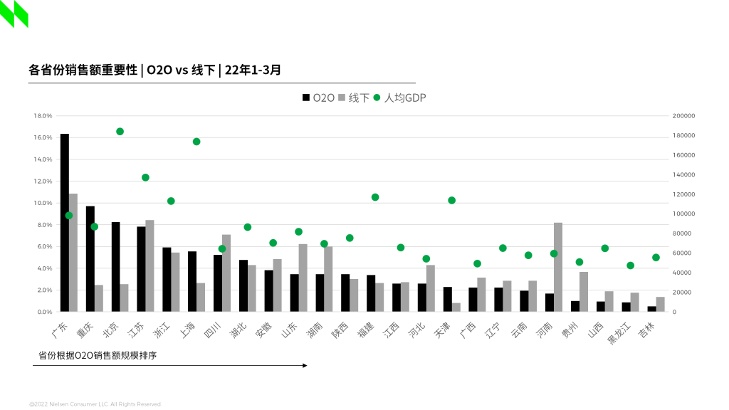 中国市场纵深广袤,O2O的发展阶段也各有先后,根据尼尔森IQ的研究发现,O2O的市场需求和发展程度,与各地经济发展程度和人民收入水平息息相关,这同样与O2O的消费者更偏“高学历”,“高收入”,“年轻化”的用户画像相辅相成,一方面,对于中国经济发展水平处于领先地位的省份,例如北京 红桃影院,上海,重庆等,消费者收入水平更高,购买力更强,对O2O的市场需求更为显著,市场重要性也名列全国前茅,可见在O2O的发展过程中,经济发达的头部省份先行,未来消费将由量变转为质变,可结合多元化的消费需求和场景,定制精细化的产品组合和营销策略,进一步实现“买更多”,“买更好”,另一方面,目前一些二三线城市O2O的生意规模处于起步培育阶段,而随着中国经济和城镇化的不断发展推进,未来这些地区的O2O市场同样具备较大发展潜力,例如河南省作为传统线下零售的消费大省,亦可优先选择当地经济发展和收入水平较为发达的头部城市群先行布局O2O业务,作为线下零售生意的延伸和拓展,而在未来将以培养用户消费习惯和粘性,迅速拓展品类渗透作为重点,进一步加速O2O的发展,先进发达的市场可为后进市场的发展之路提供参照,在研究借鉴的同时选准市场精耕细作, 。