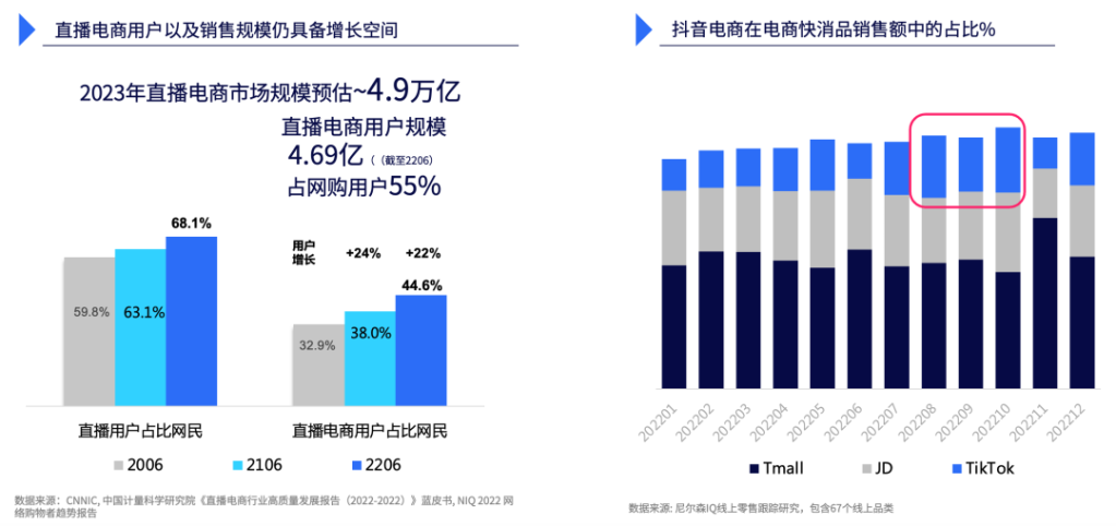 快消品红桃视频高清也正在加速向直播电商布局。根据尼尔森IQ电商零售数据研究显示,2022年,抖音电商快消品销售额在电商中的占比正波动攀升,但618、双11大促期间仍是传统电商更占优势。