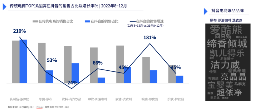 从尼尔森IQ线上渠道数据来看,在抖音电商上,多个品类的中小新兴品牌占比高于传统电商。与此同时,头部品牌也正快速向抖音转移,液体奶、即食面等品类在传统电商上销售排名TOP10的品牌,在抖音上的销售额快速增长,增速均在100%以上。