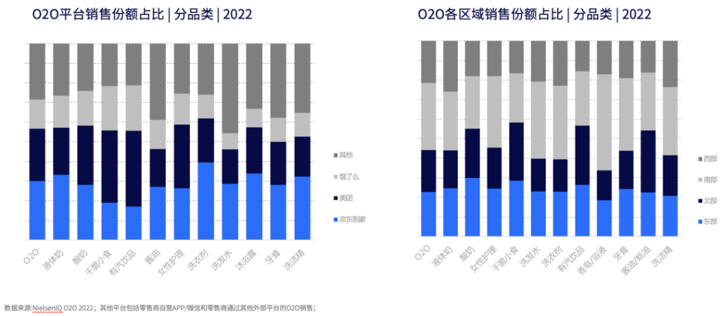 相对传统线下渠道,O2O渠道更重视洞察消费者的个性化需求和用户的精细化运营,选品、区域运营即是其中重要的两个环节。尼尔森IQ零售研究显示,O2O零售占据现代渠道的份额呈上升趋势,各O2O平台的优势品类具有差异性,不同区域对于品类的需求也各不相同,在品类布局和区域运营策略上需要各有侧重,针对性制定精准运营策略。
