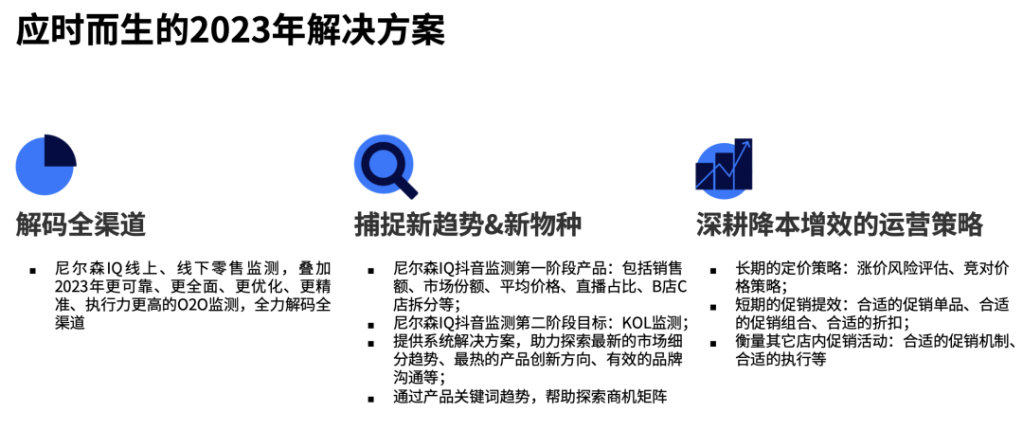 在消费环境、消费秩序逐步改善的新开局之年,为助力品牌和厂商把握机遇、乘势而上,尼尔森IQ根据当前消费发展趋势,结合数据和能力优势,打造了解码全渠道、捕捉新趋势和新物种、深耕降本增效的运营策略等三套红桃视频在线,从渠道、产品、营销方面,期待与企业同心协力、共同探索生意新增长。