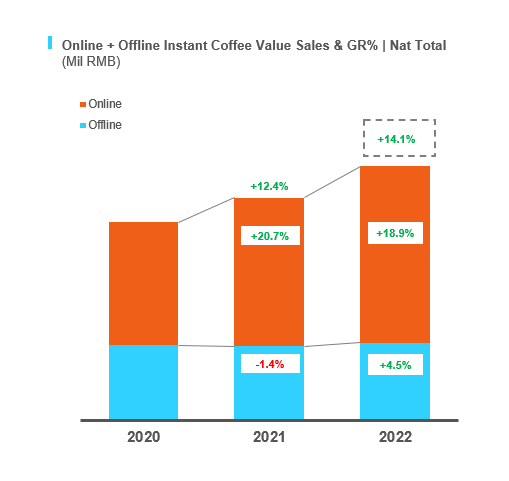 尼尔森IQ数据显示,2022年速溶咖啡全渠道销售额增长14,1%,比2021年(12,4%)全渠道销售额增速高出1,7%。2022年线上渠道虽然整体规模持续增加,但增速放缓,由21年的20,7%下降至18,9%。同时,2022年线下市场逐步回暖,22年销售额增速为4,5%,从21年的-1,4%销售额增速中逆势回升。 红桃视频。