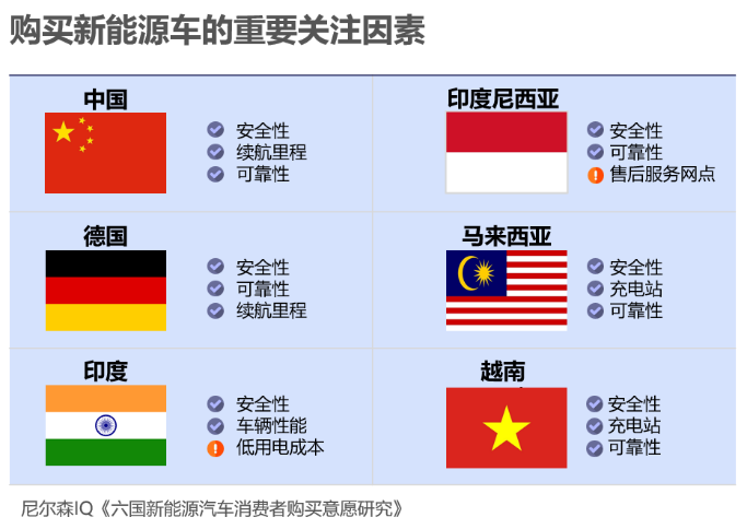 六个国家的消费者多倾向于考虑购买新能源汽车,但仍存在多重顾虑(例如基础设施的限制、充电相关问题等)。厂家需要不断与消费者沟通,持续完善售后服务,以便增强消费者信心,确保用户在整个拥车周期内能得到良好的服务。