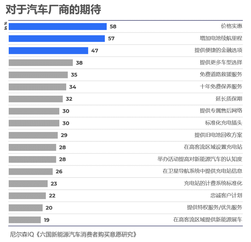 消费者对于汽车厂商的期待主要集中在三个方面:价格更实惠、缓解续航焦虑、以及推出更多可选款式。此外,消费者也强烈要求汽车厂商为新能源汽车做好售后服务的准备。