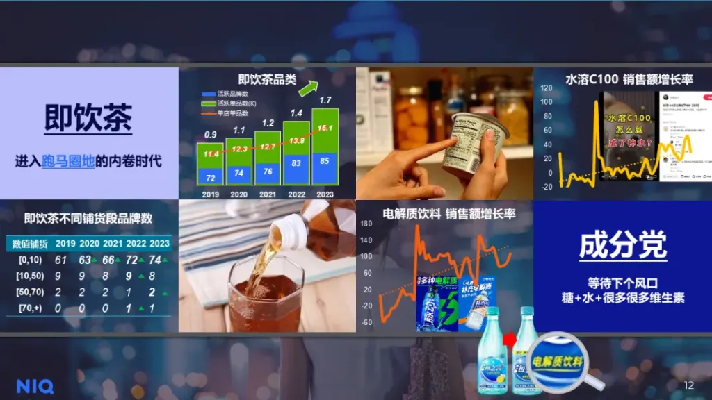 随着消费者对即饮茶的需求不断上升,各大厂商也进入了这一细分品类跑马圈地的内卷时代,尼尔森IQ监测的数据显示,即饮茶的平均店内单品数,活跃单品数在2023年均呈现了快速增长,同时,与成分有关“电解质”,“水溶C100”的概念饮料产品在疫情后快速火爆 红桃视频在线,风靡各大社交平台,引发了包括传统厂商以及中腰部厂商的共同关注,而这与疫情后消费者对于健康理念的重视以及其所能带来的价值息息相关。