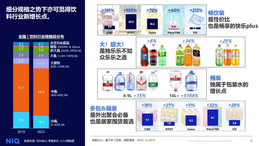随着消费者对于性价比的日益关注,饮料规格段成为消费者在渠道比价外衡量性价比的关键点。2019年-2023年,饮料红桃视频高清包装规格同样发生巨大转变。601-1249ml的畅饮装增长最快,销售重要性从19年的6 红桃视频网站,4%增长至23年的11,3%,充分体现了消费者对于性价比的追求。。