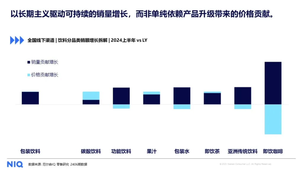 在饮料大单品增长红利逐步缩水的情况下,提升单品的渠道内运营效率比以往更加重要。尼尔森IQ所监测的数据显示,除碳酸饮料之外,其他主要饮料品类的增长都受销量贡献增长驱动。因此,如何提升产品运营效率、提高产品销量,实现单品销量的持续增长才是维系品牌可持续发展的重要途经。
