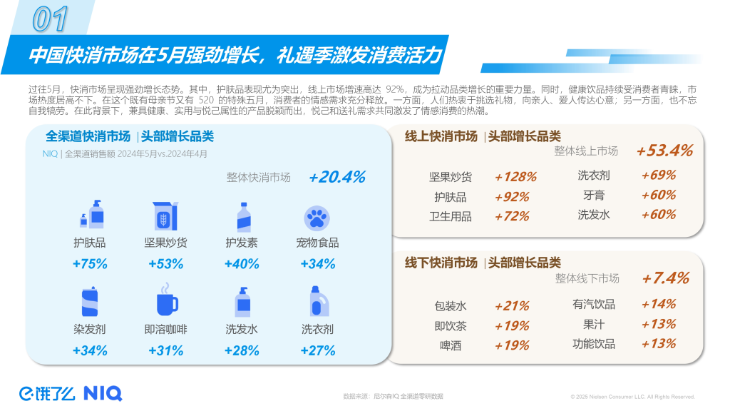 尼尔森IQ全渠道数据显示 红桃影院,每到节日聚集的5月,快消市场呈现强劲增长态势,在兼具实用与悦己的送礼需求驱动下,护肤品,护发素,染发剂等表现尤为突出,销量月环比增长超过30%,尤其在线上渠道,护肤品,洗发水增速分别高达 92%和60%,成为拉动品类全渠道增长的重要力量。