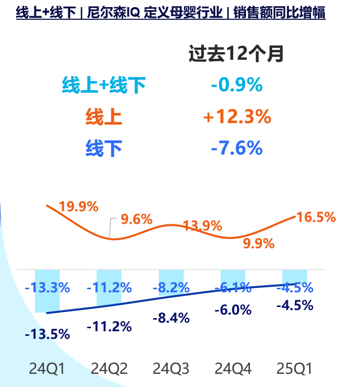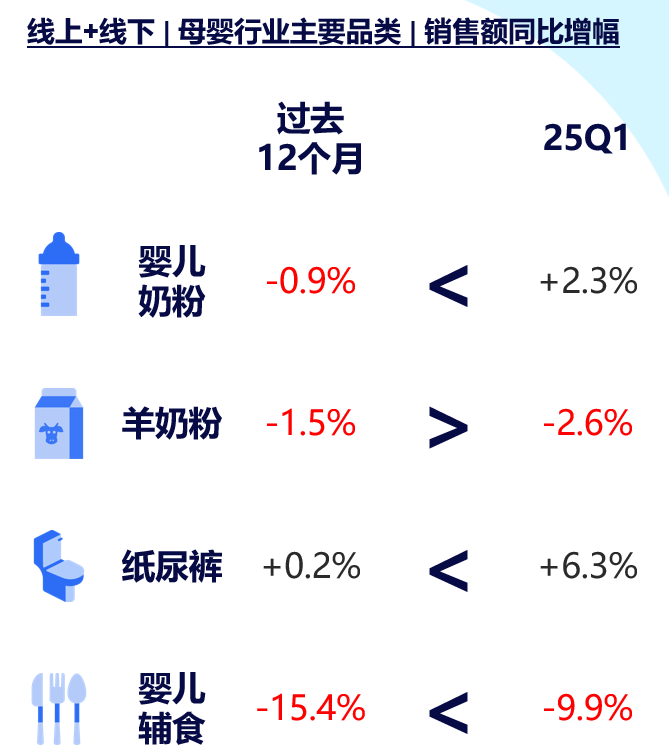 自2025年一季度,母婴品类延续复苏态势,线上渠道和去年一季度情况相似,增速显著提升,线下渠道跌幅持续收窄 红桃视频在线,需求端回暖成为核心驱动力。
