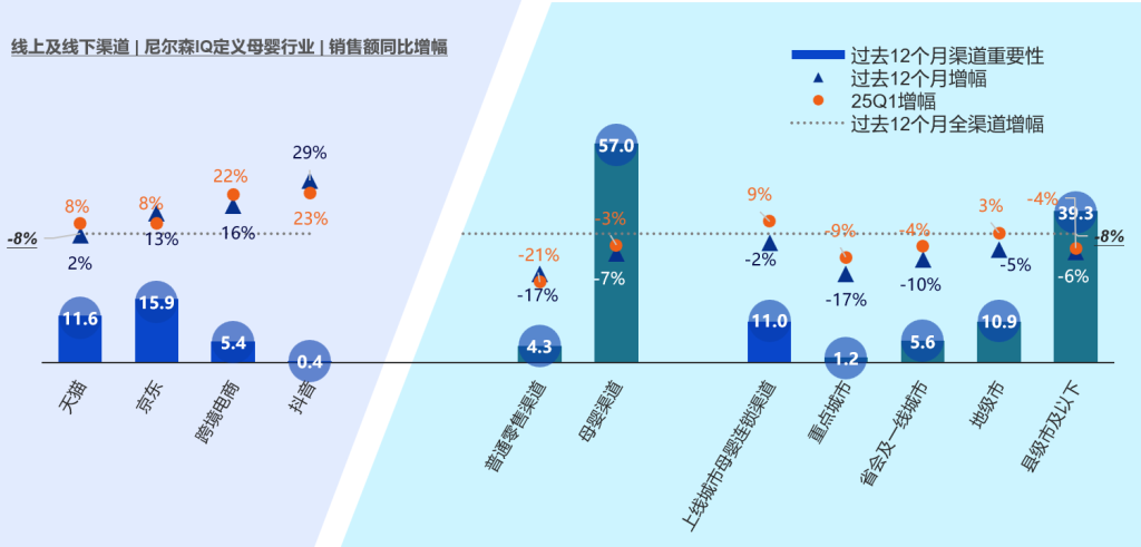 2025年一季度,母婴品类线上销售表现呈现分化态势,虽然整体增速略低于去年同期水平,但随着新生儿市场的逐步复苏,线上销售增速较2023年四季度进一步提升,从渠道表现来看,京东和抖音平台增速有所放缓,而天猫和跨境电商则表现亮眼——跨境电商凭借进口商品优势实现高速增长 红桃视频网站,天猫渠道增幅也显著高于过去12个月的平均水平,这一趋势反映出消费者对高品质进口母婴产品的需求正在持续增长。