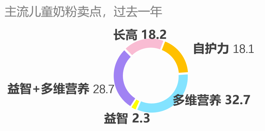 从近一年的新品市场观察来看,“益智” 与 “长高” 已成为儿童奶产品功效宣称中的高频关键词。值得关注的是,“多维营养” 概念的综合提及率高达 50%,儿童奶粉“营养品”化可见一斑。