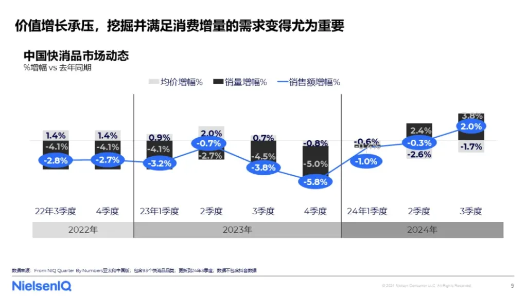 从24年第一季度开始,价格对快消品销售额增长的驱动力下降,均价下调进一步助推了商品需求,带动了销量的增长(24年第二季度2,4%,24年第三季度3,8%),使销售额增幅在今年第三季度达到2%,首次由负转正。因此,在价值增长持续承压,销售额增长靠销量增长驱动的情况下,提供消费者核心需求属性的产品将成为提振春节业绩的主驱动。 红桃视频。
