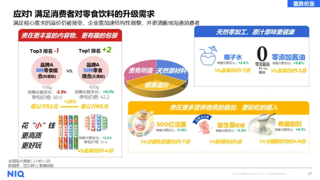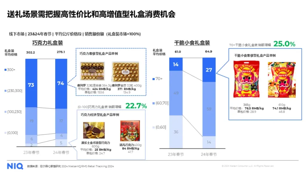 尼尔森IQ数据显示,提升产品价值感、趣味性的商品溢价在春节期间得到了消费者的认可。以同品牌的零食礼包为例,650g的10种零食组合比1,118g的8种零食组合在重量上有所减少,但单位价格却上涨了25%。这种缩量涨价的策略,并未影响消费者的购买意愿,该产品在24年春节销售中升至榜首。在缩量涨价的过程中,礼包本身的产品变得更加丰富,满足了消费者一次性购买到多款零食产品的需求。