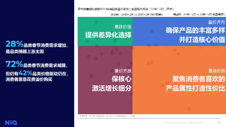 为了进一步清晰消费者的消费品类增量来源 红桃影院,我们通过运用销量增长,均价增长两大指标将品类定位到不同的象限,发现在春节期间贡献了快消品前80%销售额的消费品类中,28%的品类的销量增长推动了春节业绩提升,72%的品类则在春节期间销量下滑,同时42%的品类销量虽有下滑但均价对比去年同期提升,表明消费者在春节期间更愿意为商品支付溢价。