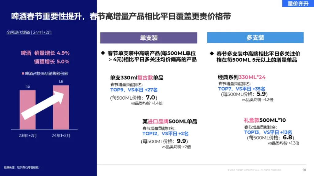 聚焦销量增长驱动春节业绩的品类,由于春节期间家庭聚餐、外出走访等节日活动频繁,消费者对于酒水的需求显著上升,24年春节期间啤酒销量(增速4.9%)、销额(增速5%)均呈现显著增长,销售重要性也同比23年春节有所提升。