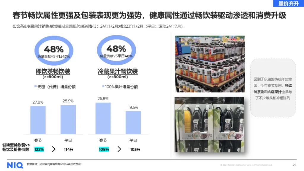 春节送礼团聚等场景也同样驱动了消费者对于饮料的需求,适用于多场景的畅饮装(≥800ml)在春节期间热度颇高,即饮茶畅饮装、冷藏果汁畅饮装销量增长、价格指数都高于其平日均值,进一步反应了春节期间显著的消费升级趋势。