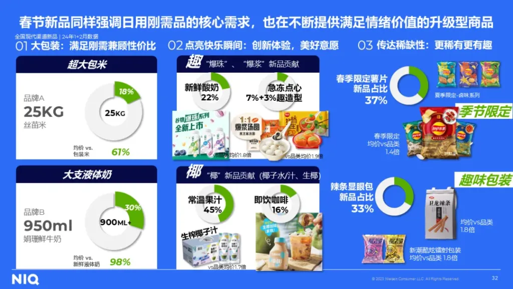 例如,在包装米新品中,占比为18%的超大包米(25kg),以及新鲜液体奶新品中占比约30%的瓶装鲜奶(900ml)均受到市场好评。这些大包装新品以低于品类均价的优势成为消费者日常刚需食品中的经济之选,展现了极高的性价比。