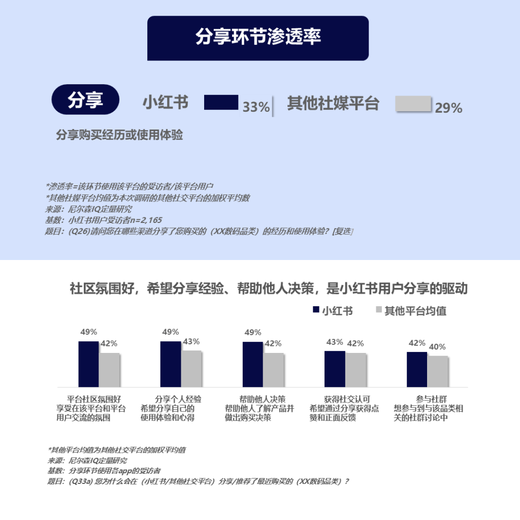 小红书平台社区氛围好,用户具有爱分享,爱互动,爱推荐的社交属性,在购买决策完成后,33%小红书用户在平台上分享了最近一次购买的数码产品体验,购物分享的比例比其他平台均值(29%)有优势 红桃视频在线,小红书购物者表示,希望可以通过分享个人经验分享来获得社交认可,同时也帮助他人做出决策。