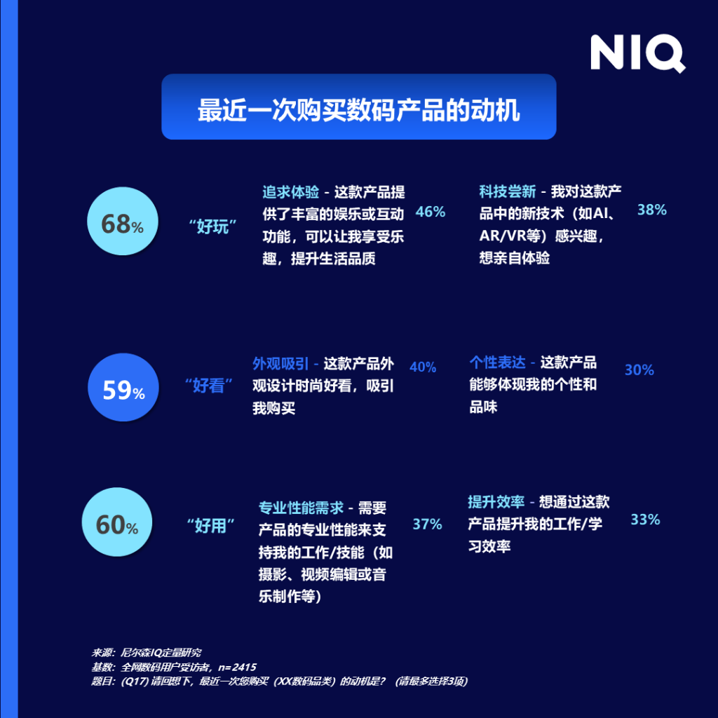 针对不同的数码产品,消费者的购买动机存在差异,数码产品的需求层次从基础需求到个性化需求 红桃视频高清,包括“能用”,“好用”,“好看”和“好玩”,本次消费者调研显示,68%的消费者表示最近一次购买数码产品是基于“好玩”(个性化需求),高于出于“好用”(基础要素)和“好看”(门槛要素)这两大基础购买因素,体现了消费者在购买数码产品时对于个性化需求和情绪价值的进一步追求。