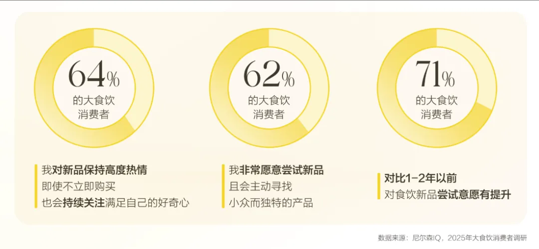 新品感知阈值因人群差异、渠道接触、品类特性等出现差异,如年轻群体更倾向于新的“审美刺激”和“社交表达”,如包装、命名、外观等是否够酷;成熟家庭更聚焦在“食用品质与健康价值”的实质升级,如原料、功效、口味等是否改善等;在社交网络时代,新品趋势也受到“集体流行”机制的影响,尼尔森IQ 2025 大食饮消费者调研结果显示,33%的消费者在别人讨论或推荐时也想尝试。