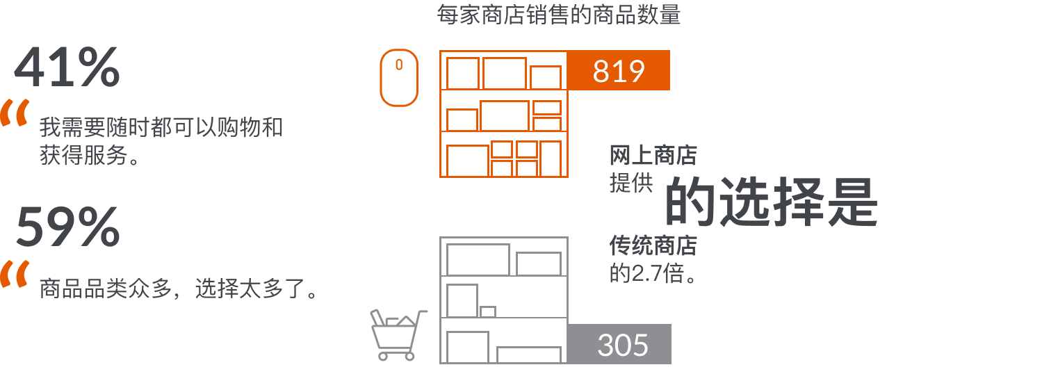 不仅社会经济因素让制定正确电子商务战略的难度增加,个人消费者的需求和期待也很重要。消费者在购买过程中所处的位置决定了他们如何看待所提供的产品组合。例如,处于探索阶段的购物者不清楚该买什么,他们可能会认为选择太多是决策中的障碍。就平均水平来说,购物者在网上面临的选择是传统零售商提供的2 红桃视频网站,7倍。然而,选择过多是消费者的普遍顾虑:全球59%的消费者赞同“我想要购买的许多品类都有太多种选择”(2019年GfK FutureBuy调研)。另一方面,对于处于购物旅程终点并准备购买的购物者来说,拥有种类繁多商品的网上零售店可以最大限度地发挥其优势。。