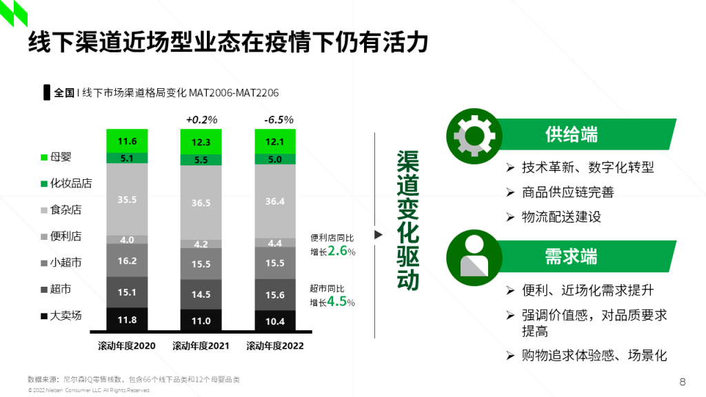 尼尔森IQ发现,线下渠道近场型业态在疫情下仍有活力。尽管截至2022年6月份滚动12个月整体线下市场渠道同比销售额有6,5%的下降,但便利店同比增长2,6%,超市同比增长4,5%。同时,供给端和需求端的变化也驱动着渠道变革,中国零售业探索新发展模式已成为大势所趋。 红桃影院。