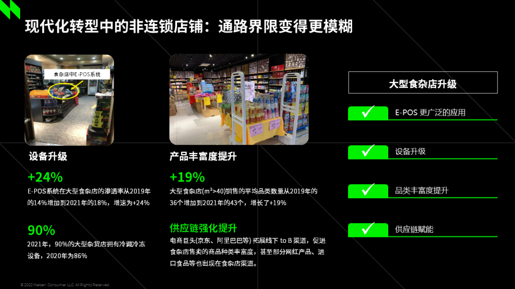 此外,由于通路界限变得更模糊,传统食杂店将迎来全面升级。根据尼尔森IQ研究显示,E-POS系统在大型食杂店的渗透率从2019年的14%增加到2021年的18%,数字化支付更便捷;同时,2021年90%的大型食杂店拥有冷藏冷冻设备(2020年为86%)。