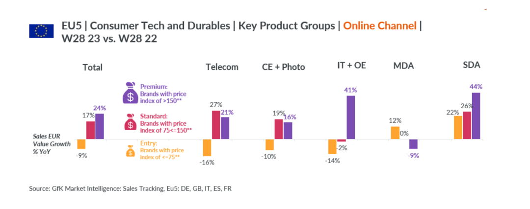 同样,在欧洲五国(指德国,英国,意大利,西班牙 红桃视频在线,法国,以下同)虽然消费需求放缓,但Prime Day大促成功地吸引了消费者打开钱包,今年的Prime Day是有史以来最成功的一次,大促期间的销售额同比上涨了5%,消费者更加关注小家电和通讯产品,他们选择在促销期间购买高质量的耐用产品,引起了相关品类销量和销额的上涨。
