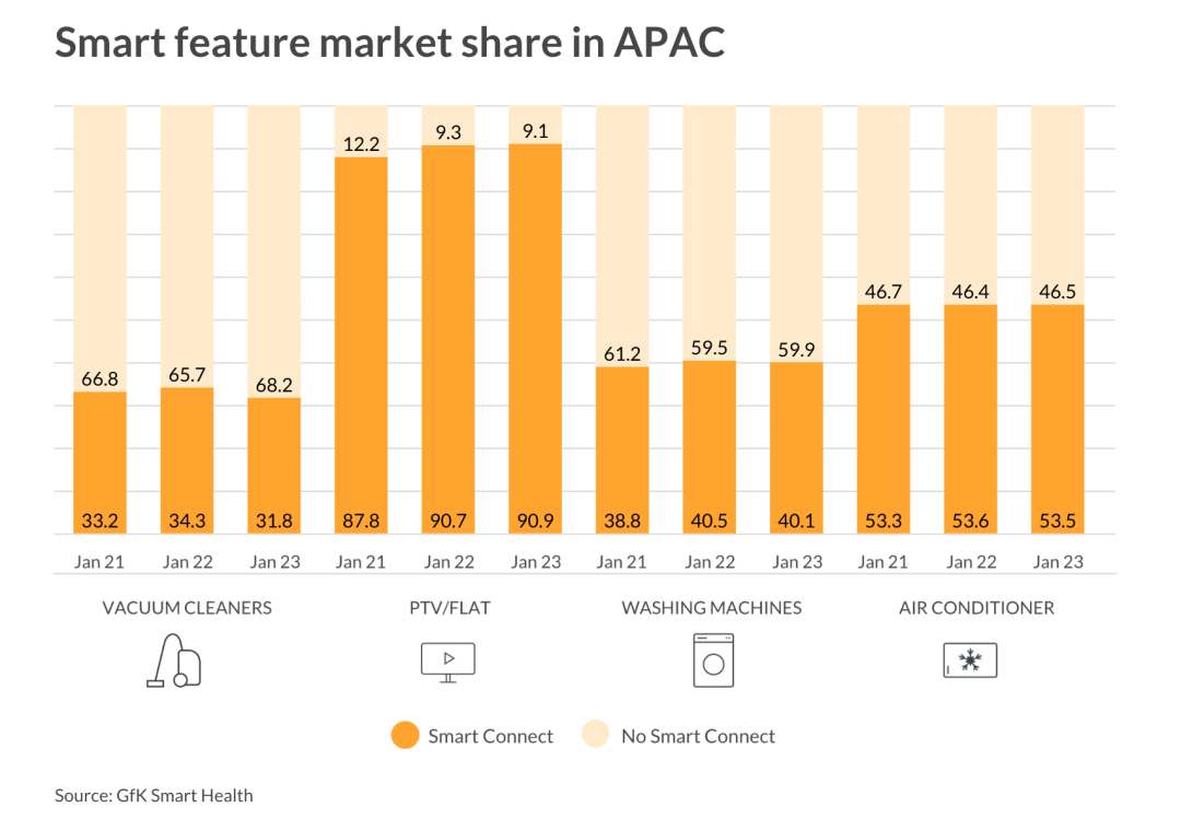 随着人们的工作生活回归正轨,个人护理市场销售额大幅增长,预计全球个人护理市场规模将从2022年的193,1亿美元持续上升至2026年的242亿美元。同时,智能家居产品大受欢迎,亚太地区消费者的消费热度明显高于全球其他地区。GfK数据显示,2019年1月至2023年3月期间,智能吸尘器、电视、洗衣机和空调的市场份额均在稳步增长。 红桃视频。