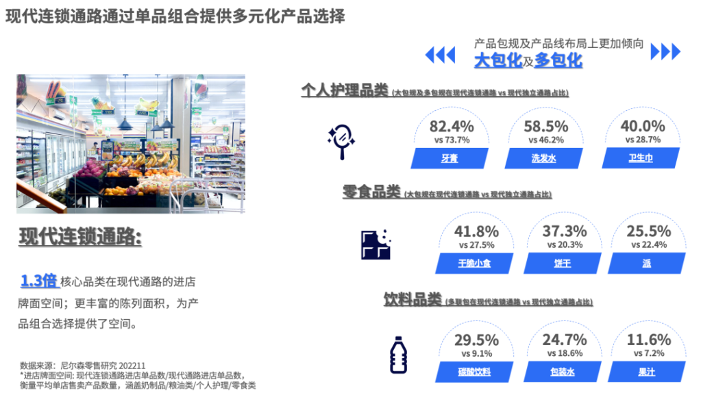 现代连锁店:从产品包规上来看,依托在空间设施方面的优势,品牌可在现代连锁店布局更多大包装及多包装产品 红桃视频,满足消费者囤货,分享型消费需求。