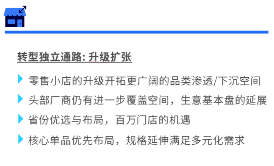 在供给端需求端双驱动下的渠道变革,为品牌带来更多机会和增长空间。对于现代连锁店,应利用自身规模优势及O2O的带来的近场便利性,优化产品布局,培育新品并提供多种产品组合,助力消费升级。而对于转型独立店,品牌可抓住店面升级带来更多铺陈空间契机,实现核心大单品在店铺及区域的优先下沉,以撬动品牌在转型独立店的增长飞轮。(末尾二维码下载报告)。