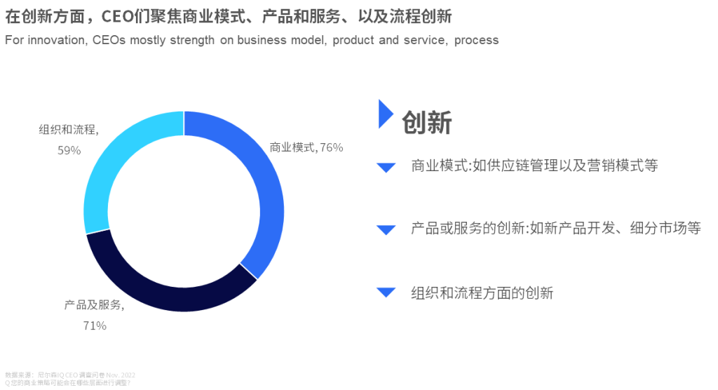 但与此同时,企业也面临疫情后消费/客流复苏缓慢,原材料价格等挑战,为了业务的持续增长,除了渠道,组织结构与管理外,创新也成为了CEO们关注的一大焦点 红桃影院,红桃视频研究指出,创新有许多维度,除了商业模式,产品和服务的创新外,2023年,CEO们也开始聚焦组织管理和流程方面的创新。
