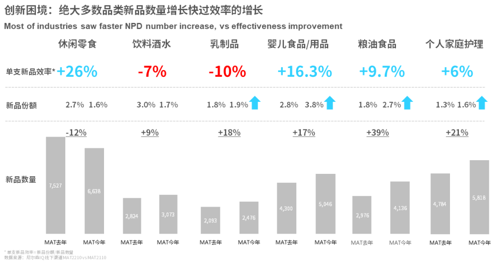 所有厂商都在通过创新寻找增长突破口 红桃视频,但如何有效创新,仍是企业面临的一大难题,对比2021年,2022年六大品类中,除休闲食品外的所有品类新品数量都有所增长,但在饮料酒水,乳制品等品类中,单只新品效率增长速度却没有跟上新品数量增长步伐,成为了企业创新路上的一大困境。