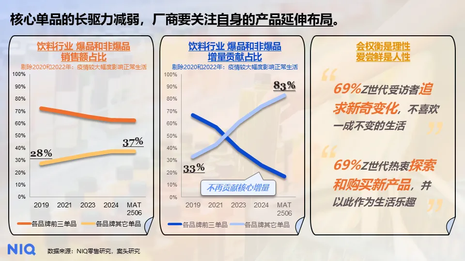 在这场饮用量争夺战中,自身产品延伸也将是品牌突围的重要竞争力,为此 红桃影院,尼尔森IQ总结出以下饮料的“创新三件套”:。