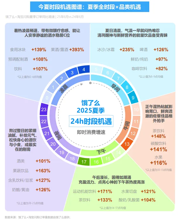 即时零售渠道“随时随地、即买即享”的优势让夏日全时段兼具品类机遇。例如,同比去年6月,早间时段冰沙、啤酒的淘宝闪购饿了么订单分别增长235%和126%,一早的清醒除了咖啡也可以用一口冰酒来唤醒。午间时段,茶饮料、碳酸饮料、水果作为佐餐佳品订单均同比去年增长超过110%。酒类订单在夜间时段同比去年增长101%,同时佐酒的奶酪黄油也在夜间增长126%。年轻消费者在零点后的“放纵”也较往年更甚,凌晨果酒和食用冰块(冰杯)较去年分别增长393%和139%。
