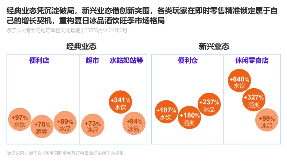 报告认为,经典业态正凭沉淀破局,新兴业态借创新突围,各类商家与平台协同,通过数据洞察精准捕捉细分场景需求,构建适配自身资源的差异化竞争壁垒,在即时服务平台精准锁定属于自己的增长契机。以冰品为例,同比去年6月,便利店、传统超市、水站奶站等经典业态的订单分别同比增长89%、73%和94%,便利仓、休闲零售等新兴业态则分别增长237%和98%。