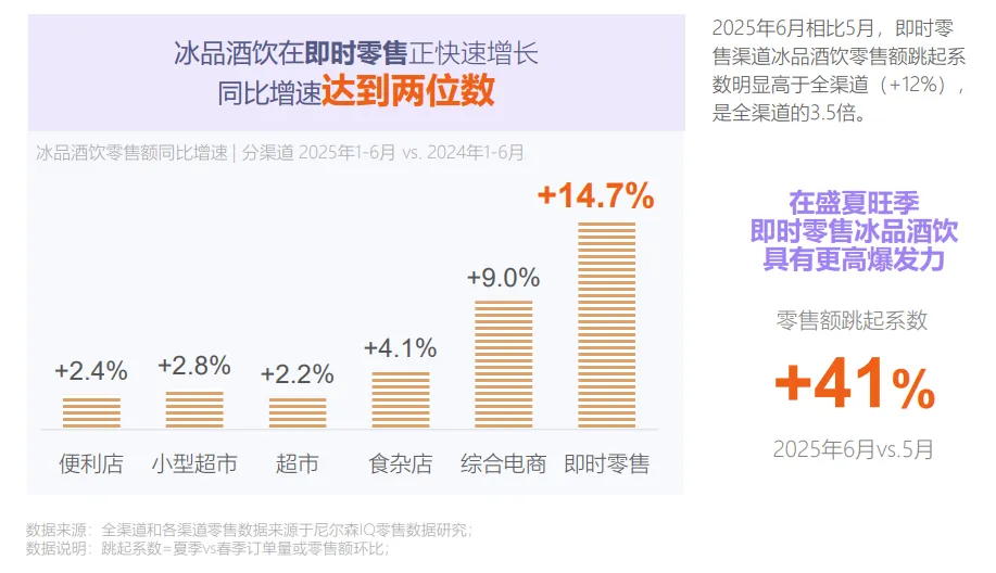 冰品和酒水饮料是消夏日消费者驱散暑热、收获心情愉悦的优选。尼尔森IQ数据显示,2025年6月冰品酒饮全渠道销售额同比增速7,1%,显著高于快消品整体。其中,夏季(2024年7-8月+2025年6月)冰品酒饮零售额占全年的31%,6月相比5月,生意月环比增长12%。而在即时零售渠道,冰品酒饮零售额环比增长41%,是全渠道的3,5倍。 红桃视频。