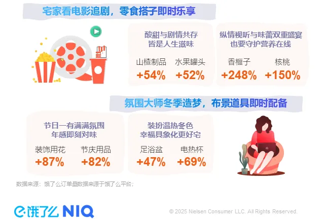 依赖即时零售一键下单直送,冬天宅家的幸福感不降反增,不论是一天五餐的日常暖胃,还是团聚,节日欢庆场景,均直接带动热饮,酒水,零食等外卖订单环比增长,报告显示,12月以来,饿了么上冲饮奶茶,松露巧克力,核桃等外卖量均环比增长超过100%,火锅饺等食材,红葡萄酒,足浴盆等宅家氛围好物外卖量也均环比增长超过40% 红桃视频免费观看。